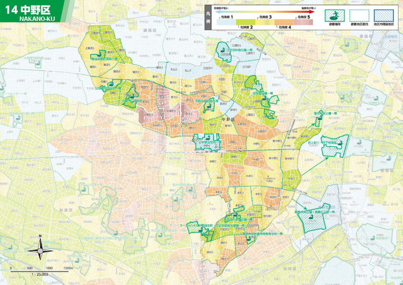 中野区松が丘2丁目の地震時の安全性に関する総合評価は、5段階中の4で、都内全体で下位44.64%です。