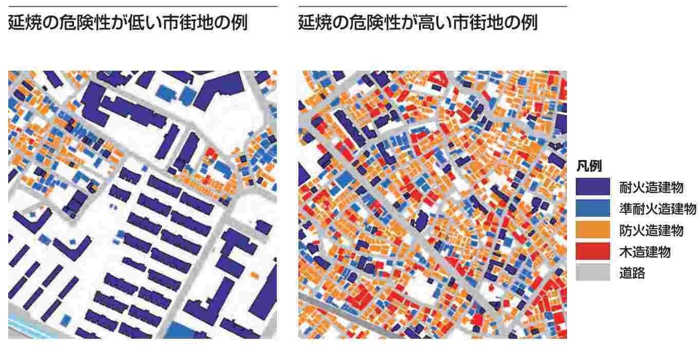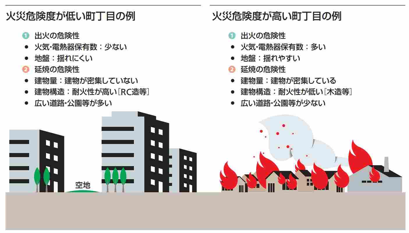 地震が起こると、地震の揺れで発生した火災の延焼により、広い地域で被害を受ける危険性があります。その危険性の度合いを、出火の危険性と延焼の危険性を基に測定したのがこの項目です。