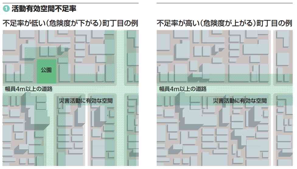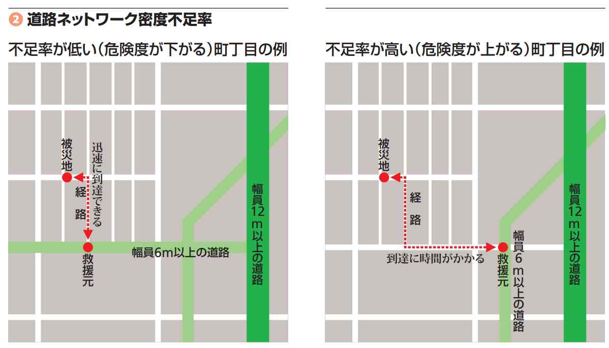 地震により建物が倒壊したり火災が発生したときには、危険地域からの避難や消火・救助活動のしやすさが、その後の被害の大きさに影響します。それを地域の道路や公園の多さ、道路網の整備状況などから評価したのがこの項目です。