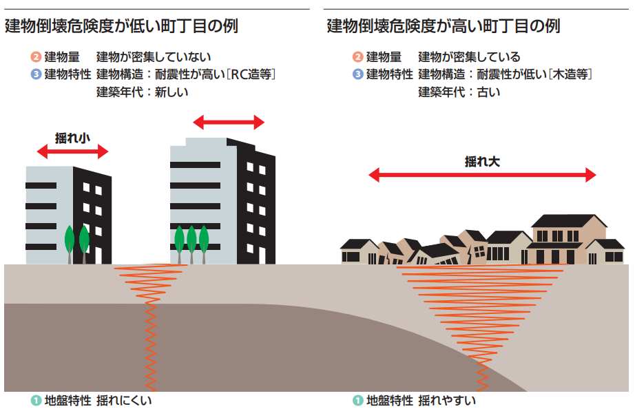 地震の揺れによる建物倒壊や火災の危険性に、避難や消火・救助など、各種の災害対応活動の困難さを加味して評価しています。